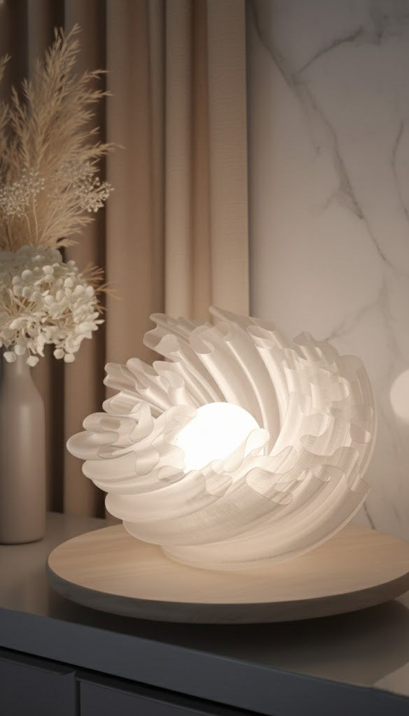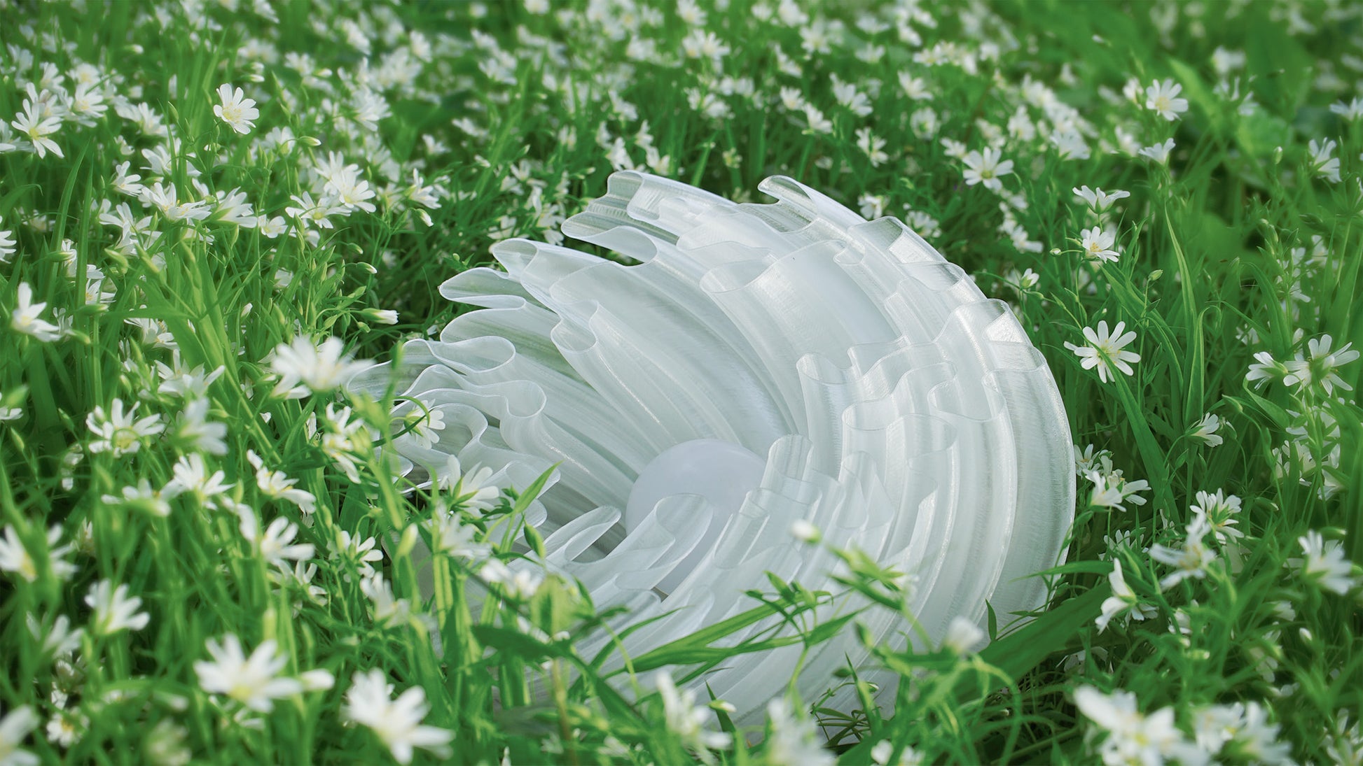 The shade is 3D-printed from renewable corn-based PLA. Lamp base: E27.