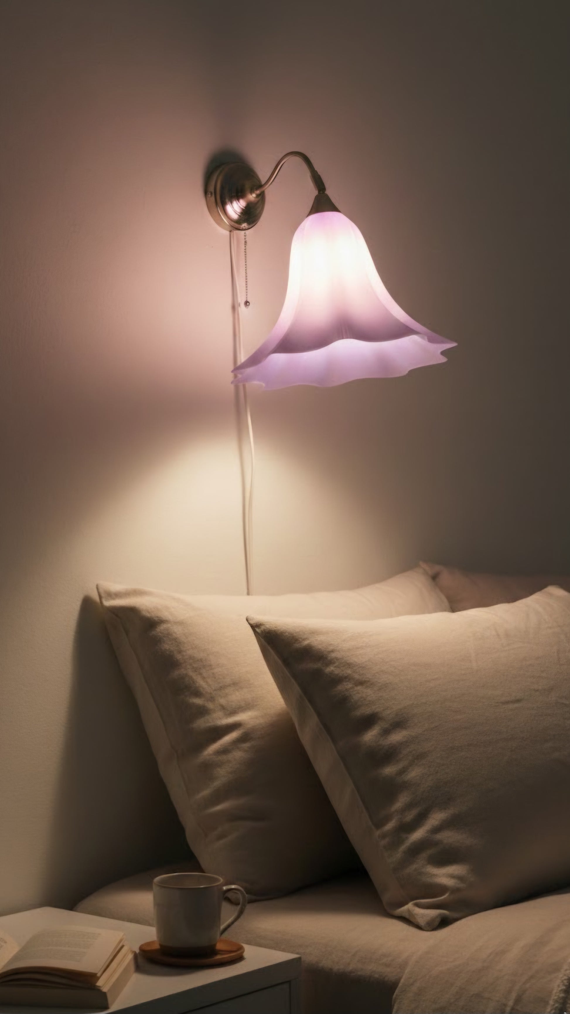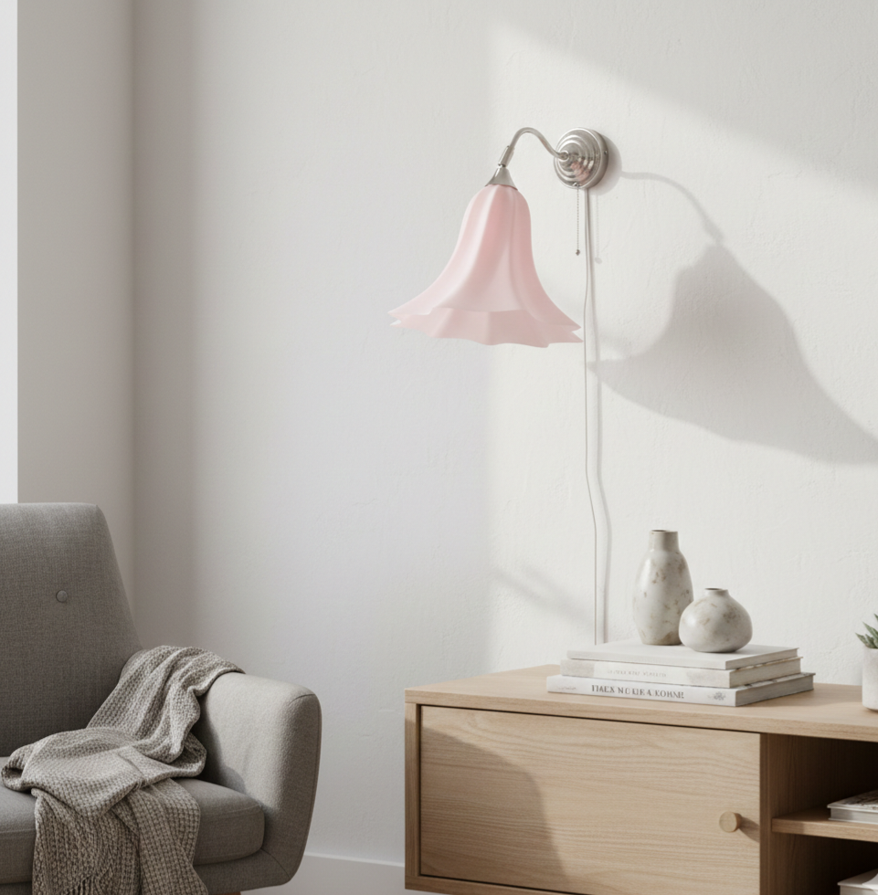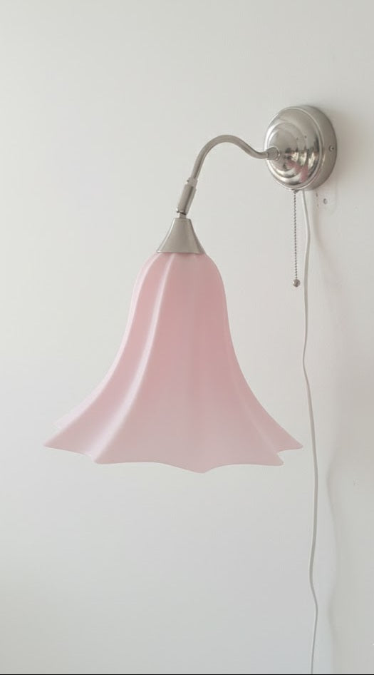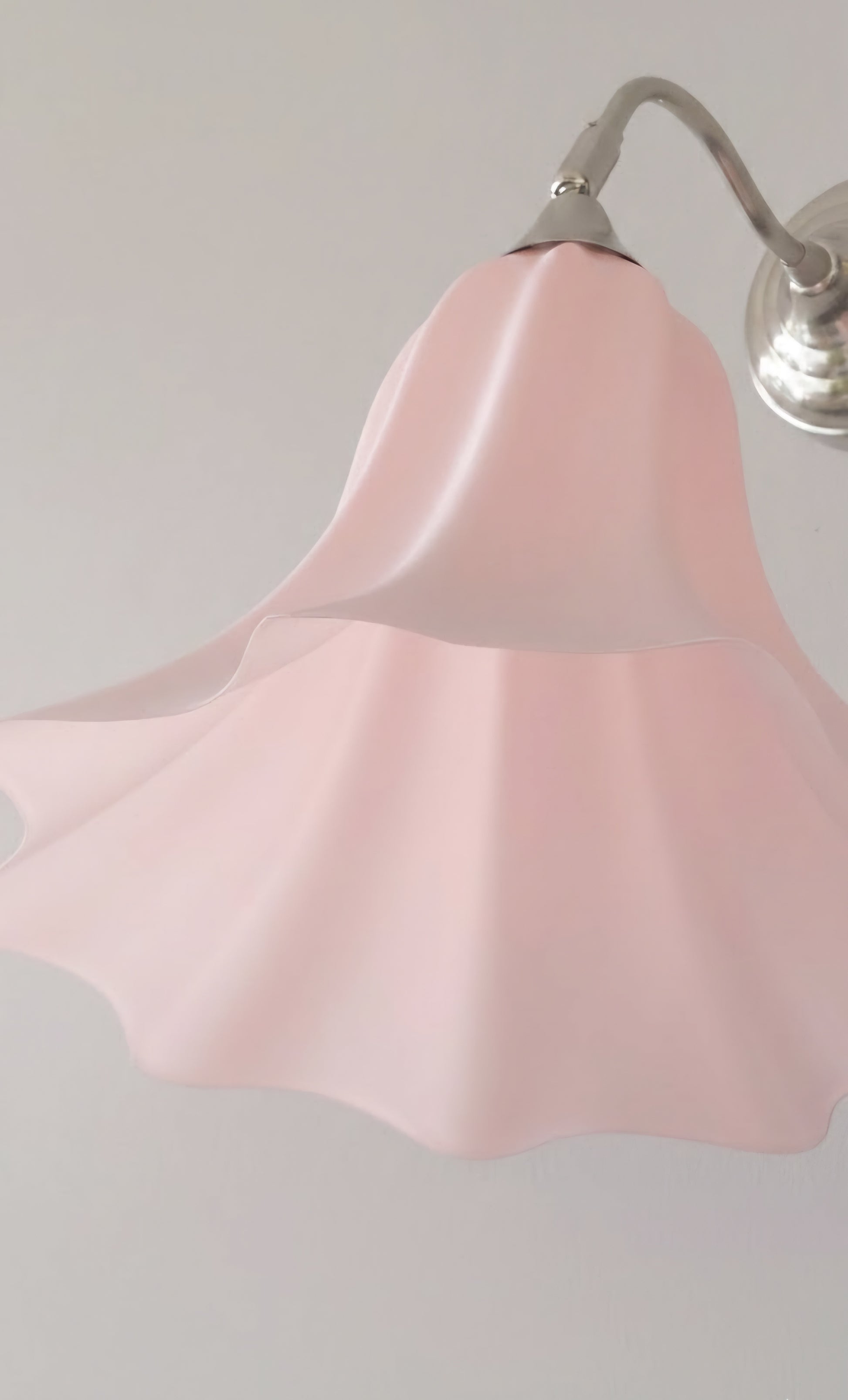 Varjostin valmistettu 3D-tulostamalla, noin 30cm leveä, E14 lampunkanta, Max 10W (ainoastaan led). Hopean väriset metalliosat, jotka sulautuvat ympäristön sävyihin